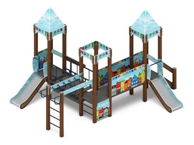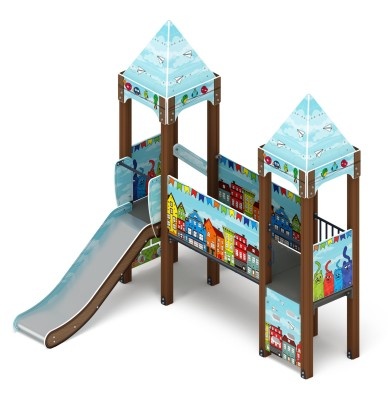 Выполнена из четырёх клеёных брусьев, окрашенных в коричневый цвет, сечением 100х100 мм и высотой 2500 мм. Пол из ламинированной фанеры с антискользящим покрытием размером 780х780 мм толщиной 18 мм. Башня украшена стилизованными декоративными арками (780х330х18мм) и четырехскатной крышей, крыша поставляется в сборе и выполнена из влагостойкой фанеры толщиной 12 мм (габариты в сборе 770х770х740мм), кромки фанеры тщательно шлифованы, окрашены с нанесением принта. Отметка пола башни от планировочной отметки площадки 900 мм |