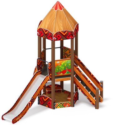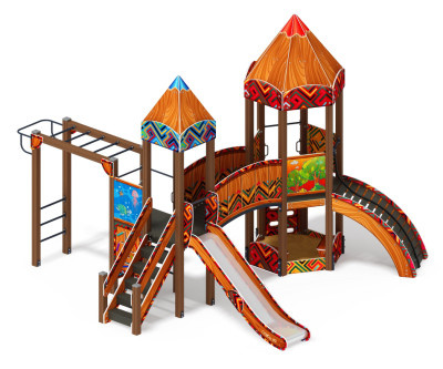 Спаренная башня из шести клеёных брусьев 100х100 мм высота 3000 мм-4 шт. и 2200 мм- 2 шт.; полы из ламинированной фанеры, с анти-скользящим покрытием 1460х780мм толщиной 18мм. Башня состоит из двух частей, над частью с горкой имеется четырёхскатная крыша из фанеры толщиной 12 мм, кромки фанеры тщательно шлифованы, фанера окрашена с нанесением принта. Башня украшена стилизованными декоративными арками (780х380х18мм) и четырехскатной крышей, крыша поставляется в сборе и выполнена из влагостойкой фанеры толщиной 12 мм (габариты в сборе 770х770х740мм), кромки фанеры тщательно шлифованы, окрашены с нанесением принта. Отметка пола башни от планировочной отметки площадки 1200мм. Высота башни 3740 мм Шестигранная башня выполнена из шести клеёных брусьев 100х100 мм высота бруса 3000 мм; пол из ламинированной фанеры, с антискользящим покрытием мм толщиной 18 мм по лагам из ламинированной и влагостойкой фанеры. Над башней имеется шести- скатная крыша из фанеры толщиной 12 мм, кромки фанеры тщательно шлифованы, фанера окрашена с нанесением принта. Крыша поставляется в сборе. Внешний периметр крыши закрыт декоративными арками из влагостойкой фанеры толщиной 18 мм, габарит арки-780х380 мм. Отметка пола башни от планировочной отм. площадки 1200мм. Высота башни 3970 мм. |