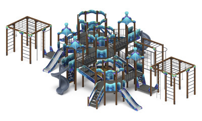 Башни из четырех клеёных брусьев 100х100мм высота 3000 мм и 2500 мм. Полы из ламинированной фанеры, с анти-скользящим покрытием 1000х1000мм толщиной 18 мм. Одна башня украшена четырехскатным куполом-скаты из фанеры толщиной 12 мм, которые крепятся на декоративные арки из фанеры толщиной 18 мм, купола окрашены с нанесением принта «Морской». Крыша поставляется в собранном виде. Размер башни с куполом 1000х1000х4040(h), вторая башня 1000х1000х2500(h). Отметка пола башни с крышей от планировочной отм. площадки 1500 мм. Отметка пола второй башни от планировочной отм. площадки 1200 мм. |