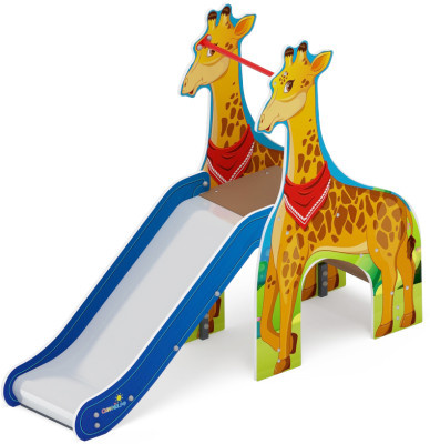 Скат горки шириной 530 мм, высота стартовой площадки горки 750 мм, выполнен из нержавеющей стали толщиной 1,5 мм из цельного листа, борта выполнены из влагостойкой фанеры толщиной 24 мм, кромки фанеры тщательно шлифованы, борта окрашены в синий цвет. Опорный каркас горки выполнен из профиля 40х25 мм и труб диаметром 32 мм (металл имеет плавные радиусы и тщательную обработку швов, покрыт порошковой краской синего цвета). Стартовая площадка горки ограждена стальной гнутой перекладиной из трубы диаметром 24 мм, и бортами ограждения из 18 фанеры желтого цвета. Размеры горки 1230х530х750 мм ( длина х ширина х высота)