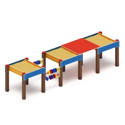 выполнена из восьмиклеёных брусьев не более 100х100 мм высота 750 мм дно песочницы- из ламинированной фанеры габаритом 820х1000 мм, толщиной 18 мм, борта из фанеры толщиной 18 мм, кромки фанеры тщательно шлифованы. Песочницы (2 шт) объединены в единую конструкцию столешницей- столешница из березовой фанеры толщиной 18 мм, Габариты 1000Х1000 мм. Фанера окрашена в синий и желтый цвет и красный цвет. Брус окрашен в бежевый цвет